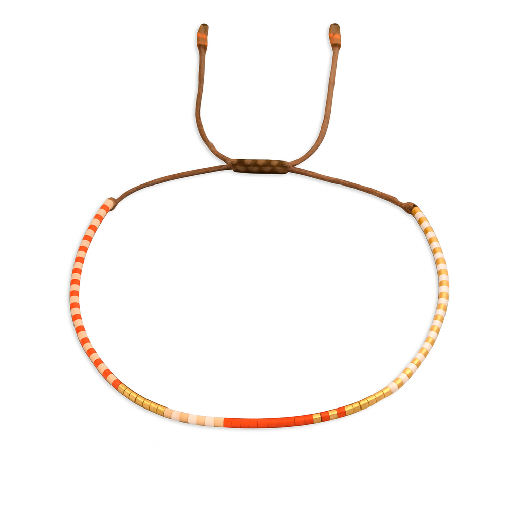 Playful and chic, the Cory Bracelet adds a burst of color to your wrist stack. Strung with dainty orange, gold, and white beads, it brings a bright and fun touch to any outfit—whether paired with casual tees or dressed-up looks. Designed on a sturdy adjustable nylon cord, it’s as durable as it is stylish, making it a cute everyday favorite and a thoughtful gift.